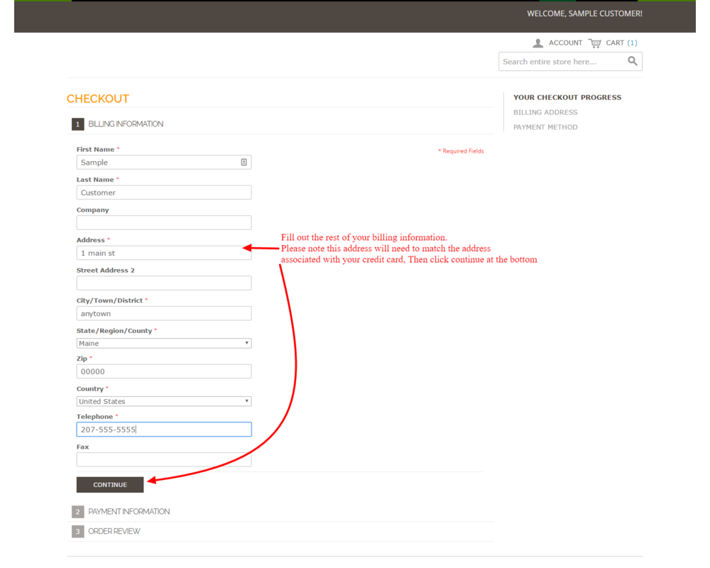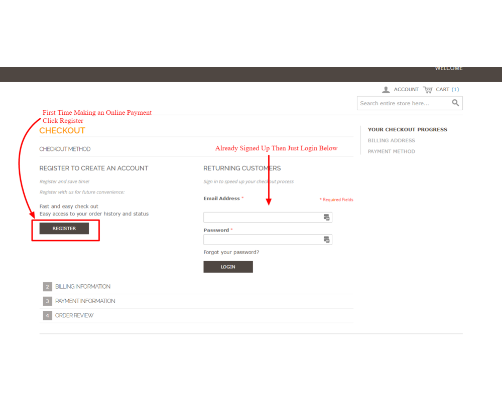 Returning users can click on the button and go directly to the payment area. New users can use the gallery below for a step by step sign up process. You will only have to create an online account with us once. Returning users can use their login info.